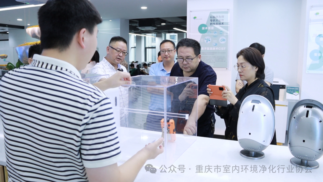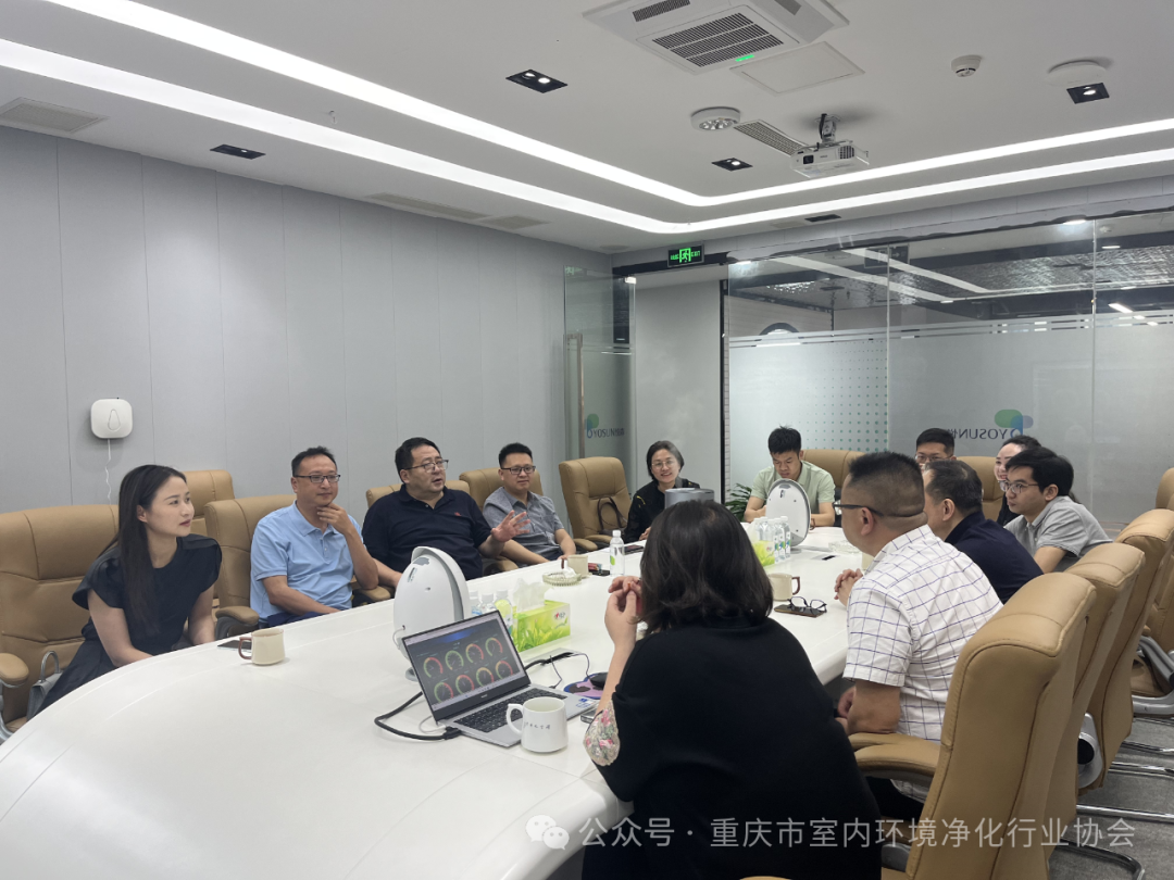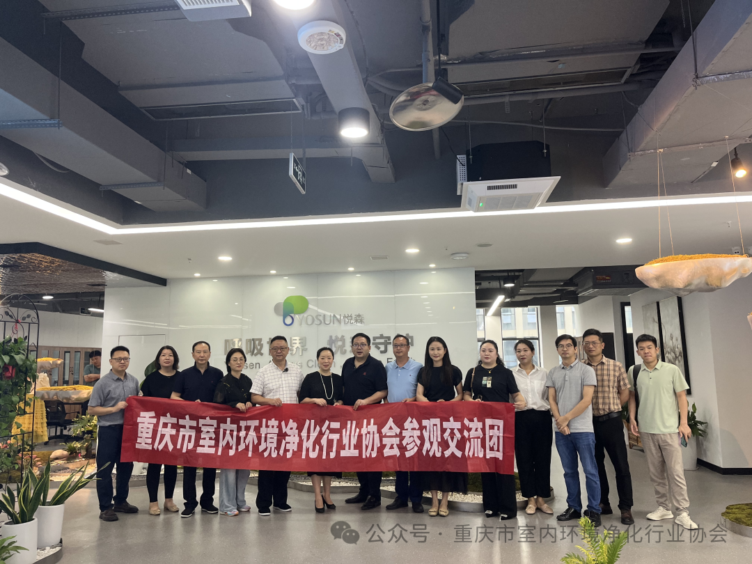 2024年5月28日上午,重庆市室内环境净化行业协会会长肖华,副会长单位重庆思源建筑技术有限公司总经理周兵、重庆再升科技股份有限公司无尘空调事业部总经理袁良华、重庆三叶风环境科技有限公司总经理裴富强、重庆郎岭新材料科技有限公司总经理杨健,理事单位华翱洁净科技(重庆)有限公司总经理李琴,会员单位重庆科标计量检测有限公司总经理杨俊鸿,监事长何栋,秘书长肖继攀等一行前往理事单位重庆悦森生态科技有限公司进行走访考察交流,重庆悦森生态科技有限公司公司负责人陈晓晖、董杰热情接待,并召开座谈会。