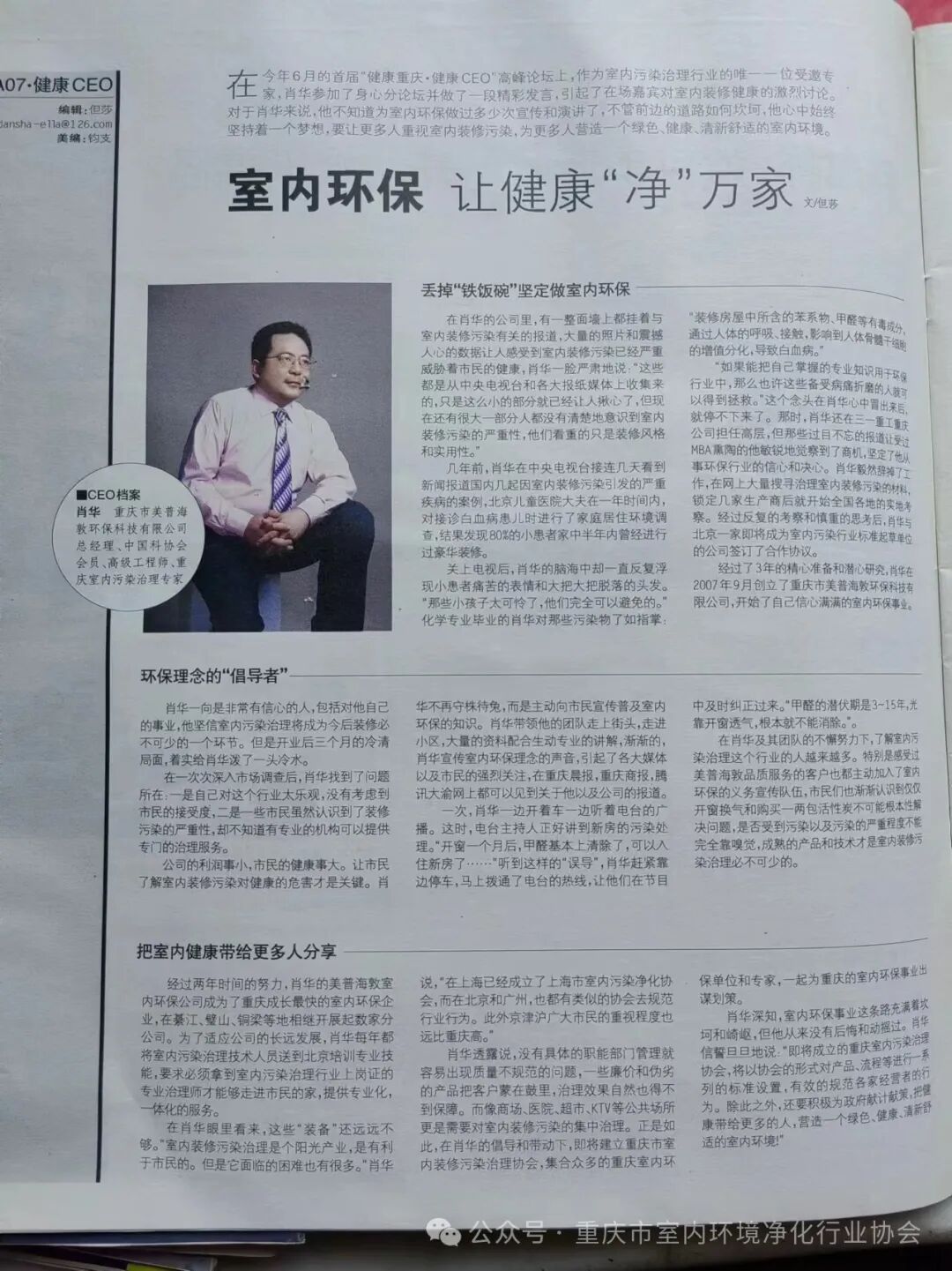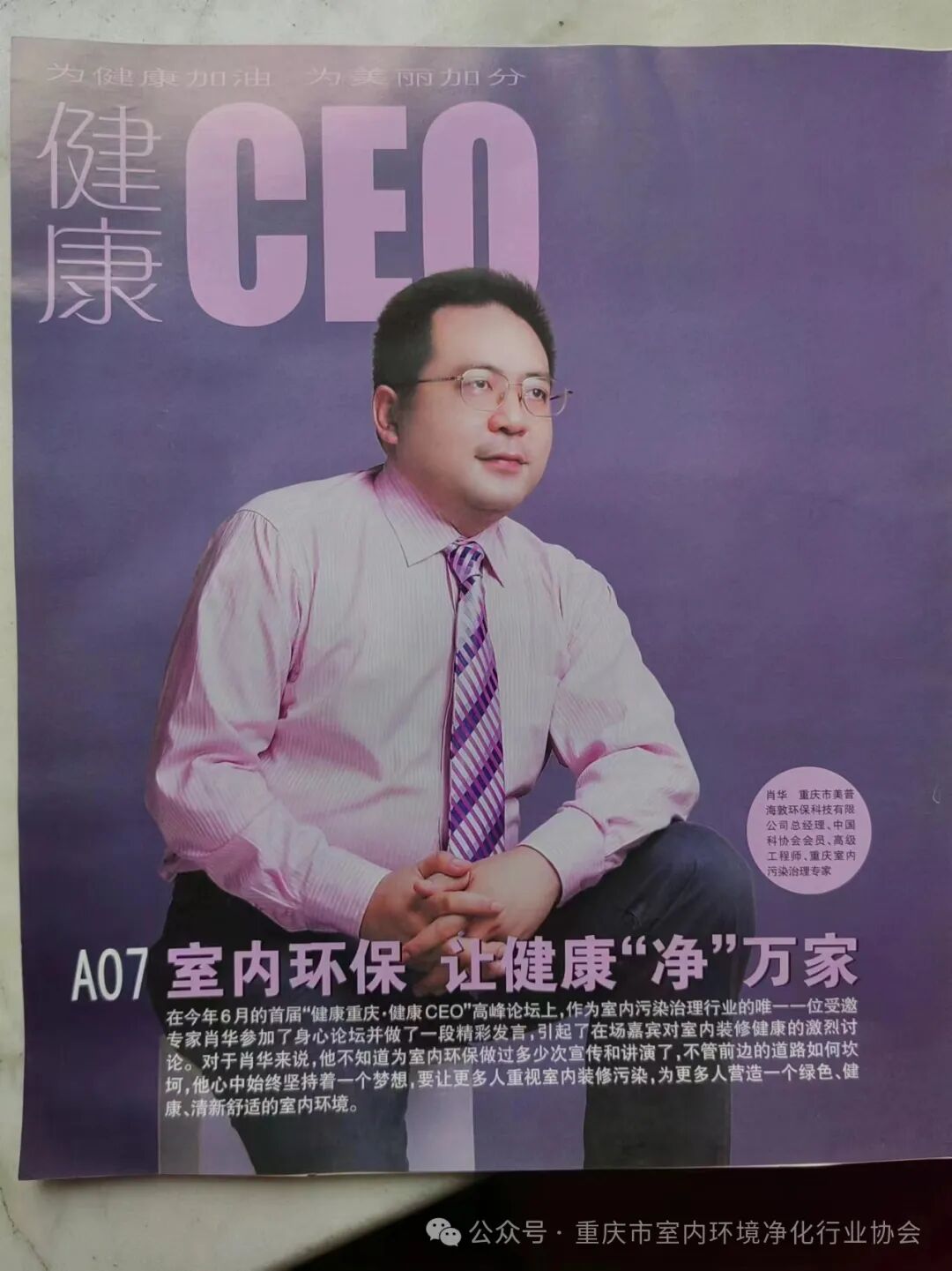 重庆市室内环境净化行业协会肖华会长曾受邀参加“健康重庆.健康CEO”高峰论坛,代表重庆市室内污染治理行业发表精彩讲话。